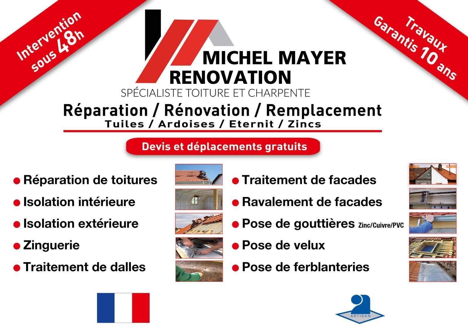 Michel Mayer Rénovation est une société du bâtiment spécialisée dans tout ce qui concerne les travaux de toiture, la charpente, vos façades et cela dans le neuf comme dans la rénovation. Nous pourrons vous aider en ce qui concerne la couverture toiture, vos problèmes de fuite d'eau de toiture, l'isolation toiture, la réparation de gouttières le nettoyage et démoussage toiture ou la création d'une fenêtre de toit.